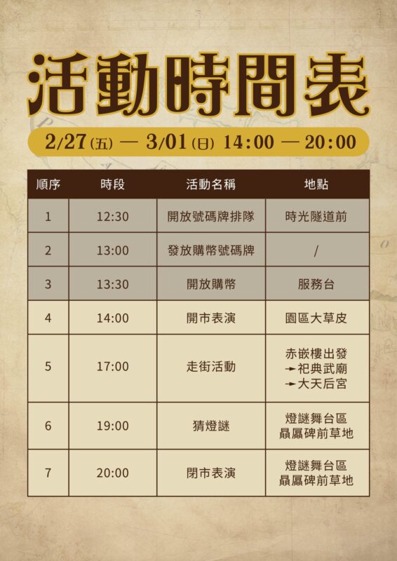 • 開市表演:下午2時盛大開市,古人出場歡迎所有穿越而來、共襄盛舉的客倌。