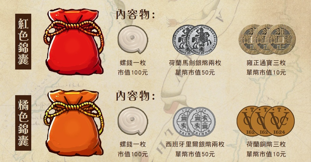 一包小錦囊內含隨機3款古幣,售價250元,可兌換市集內230元等價商品或服務,拿著古幣逛熱蘭遮市集最對味~~