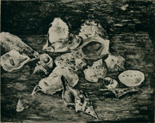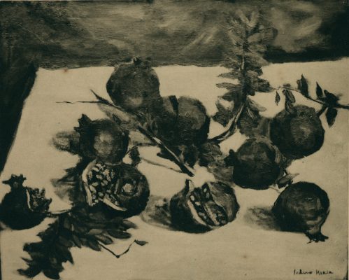 而從〈貝殼〉與〈柘榴〉兩件靜物畫作品中,可以看到堀江一郎在描繪靜物作品時,擅長透過簡單的構圖方式,細膩地勾勒出靜物的輪廓及樣貌。如貝殼上的孔洞與不同的質地,深刻表現出殼面紋理的明暗變化。亦或是裂開的石榴,露出中間的隔膜與裡面飽滿的籽粒,著力於描繪葉子的姿態與果實的光影變化。