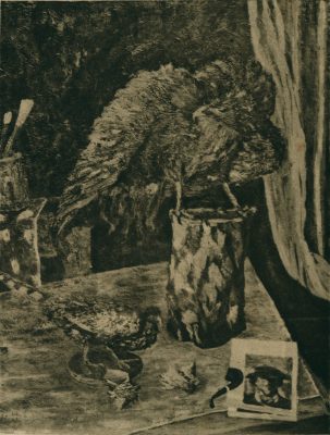 〈剝製及其他〉作品名稱中的「剝製」,是指將動物皮膚取下,經過處理後保存其外觀,用於標本展示。本作中央置有一隻貌似鷹隼的猛禽棲立在粗壯的樹墩上,身體微蹲、翅膀半展、頭側凝視,呈現警覺的姿態相當醒目。左側下方的鳥類體型較小,根據尾羽特有的花紋,判斷應是帝雉。畫家運用筆觸勾勒出鳥類羽毛層層疊疊的樣貌,予人生動的美感。