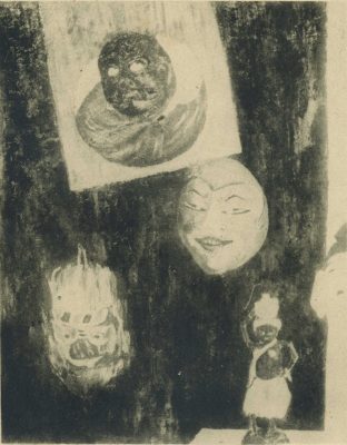 1942、1943年當時正在老松國民學校擔任訓導的堀江一郎,分別以〈剝製及其他〉與〈面具與人偶〉入選第五、六回府展。相較於前幾幅作品是以單一物件為主題的靜物畫,這兩件作品描繪的則是多樣物件的組合,呈現出更為豐富的畫面層次。