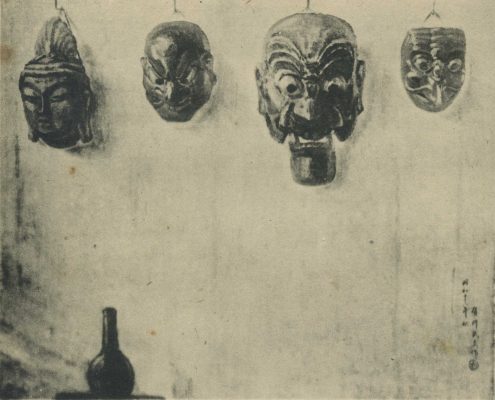 除此之外,同樣入選第六回府展的作品中,有川武夫的〈納曾利面等〉也是以「面具」作為題材所繪製的作品。不同於有川武夫較為寫實的構圖及繪畫技法,堀江一郎加入貝殼、人偶等物件安置於畫面中,使整件作品呈現出充滿意象的超現實感,也展現畫家有別於之前幾件作品的繪畫風格。