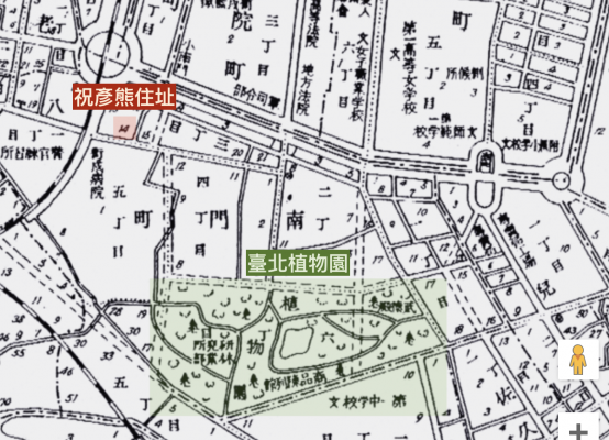 - 〈臺灣總督府殖産局附屬林業試驗用地改稱ノ件〉,《臺灣總督府報》,1921-01-22,國史館臺灣文獻館,典藏號:0071022297a002;吳明勇,〈日治時期「臺北植物園」之設立及其社會功能〉,《臺灣林業專訊》第14卷第6期(2007),頁18-21;〈酒類賣捌人指定申請書 祝彥熊〉,《臺灣總督府檔案》,國史館臺灣文獻館,典藏號:00103807006。
