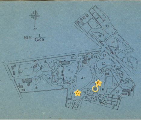 〈午後的植物園〉(圖1)描繪一條向左蜿蜒的道路,道路兩側種滿樹木植栽。畫面前景及中景處,依稀可見兩道向右彎的小徑。植物群之後隱現一建物的斜屋頂,建物前方還有高聳的棕梠科植物。筆者嘗試比對臺北植物園的老照片,以及園內各建物與道路的關係後,認為畫家可能用畫筆捕捉圖3中星號A往星號B望去的風景。而〈午後的植物園〉遠景的建物,即為圖3黃圈處。