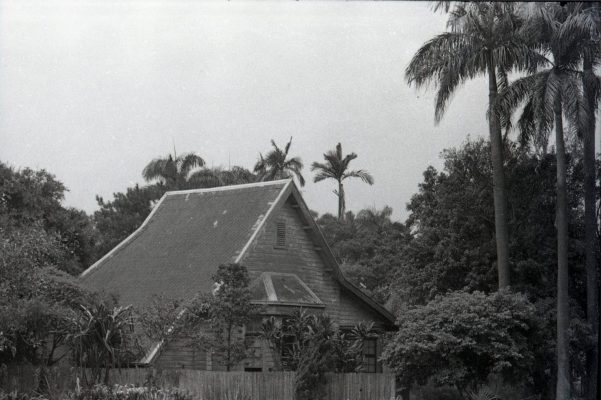 1918年的《臺灣總督府殖產局附屬 林業試驗場植物要覽》收錄的林業試驗場地圖(圖4、圖5),顯示圖3圈圍出的建物在臺北苗圃改制為臺北植物園之前就已經存在,作為休憩所使用。該建物在戰後初期成為圖書館,至晚於1964年因火災焚毀。(註4)林業試驗所收存一張戰後拍攝圖書館的底片(圖6),底片中的圖書館有著白色包邊的斜屋頂,前後立著雄偉的棕梠科植物,與〈午後的植物園〉裡的景況不謀而合。