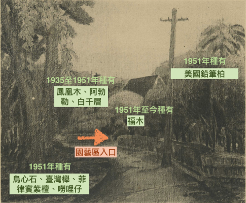 1912年臺北苗圃西北方的區域便已培植許多園藝植物(圖7),1918年的地圖(圖4、5)提示該處被規劃作園藝區(粉紅底色)使用,且延續至戰後初年。(註5)換言之,〈午後的植物園〉可能記錄下園藝區入口一帶的景致。現存描述了臺北植物園物種栽植位置的歷史資料,最早可追溯到1935年。(註6)筆者嘗試將1935年以來園藝區入口處一帶栽植過的植物物種,標示於作品上(圖8)。(註7)