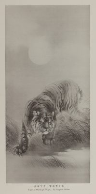 在〈月下猛虎〉中,一頭猛虎身披月華從容前行,斑斕皮毛水滑油亮,毫釐般的細絨根根分明。虎頭微側,虎掌前伸,畫面動感靈活,襯托著身後朦朧月色,盡顯山林主宰的懾人威勢。池上秀畝在這幅作品融合西洋自然寫實畫風與傳統文人畫主題,呈現出對動物形貌姿態的通達掌握和日本畫的創新嘗試。