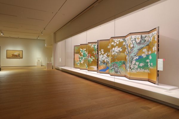 除了動物畫,池上秀畝於傳統花鳥畫方面更是造詣深厚。1924年,他受男爵藤田平太郎委託,創作獻給裕仁皇太子的結婚賀禮〈國之華〉。(註12)六曲一雙的金屏風上分別繪有象徵日本的櫻花樹及代表皇室的紅白二色菊花,以胡粉敷塗的盛放白菊與紛飛白櫻典雅秀麗,素淨卻不覺寡淡,於華麗金色背景映照下仍保有鮮活立體感和分明層次,細節處顯見其功力。