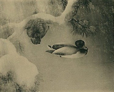 1931年,時年57歲的池上秀畝受邀來臺擔任臺展審查員。除了負責臺展東洋畫部的審查評選,他也於一天半內迅速完成〈吹雪〉及〈時雨〉兩幅出品畫作。〈吹雪〉描繪冬日松枝下浮於水面避雪的一對野鴨,以迅疾筆觸呈現雪花急驟落下的動勢,並運用深淺明暗的色調對比,成功烘托出暴風雪之際凜冽酷寒的氛圍。(註13)