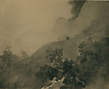 〈時雨〉則畫山間驟雨之際,空氣中水氣氤氳瀰漫的景象。中景的山坡草叢間,一頭鹿背對觀者,彷彿對突如其來的大雨感到迷惘而無所適從。山巒與遠方景致隨著畫面斜上延伸若隱若現。池上秀畝靈活運用渲染技巧,搭配筆墨濃淡與色彩層次變化,細膩地捕捉並傳達出雨中山林朦朧飄渺的氛圍。(註14)