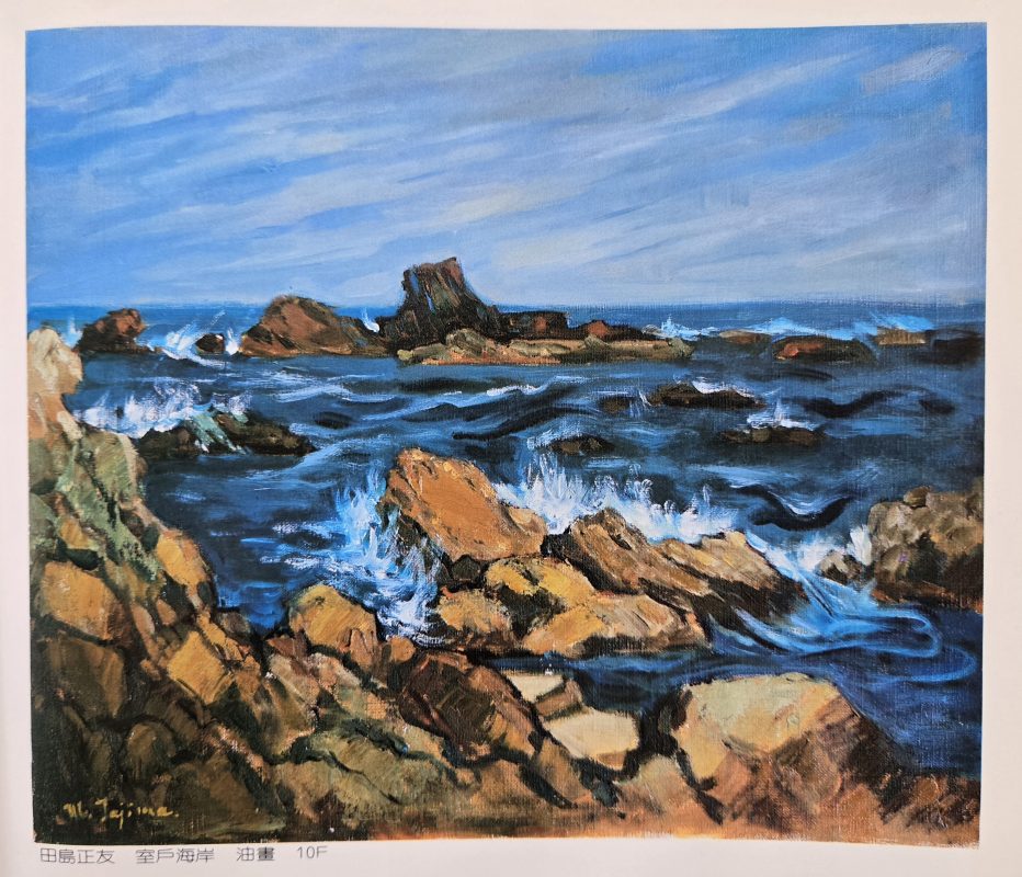 本文主角——田島正友(1918-2009)畢業於北一師,第六回芳蘭美展(1980)首次出現他的作品與姓名,之後的歷屆畫冊都可見他的畫作。第十二回芳蘭美展(1990),他以〈室戶海岸〉參加展出(圖2),作品畫的是日本四國的室戶岬景觀,和臺灣的北海岸極為相似。更讓筆者驚喜的是:第十二回畫冊印有參展人的聯絡電話與地址。透過日本友人努力不懈的幫忙,竟能藉此三十餘年前的資訊,聯繫上田島正友的兒子田島正嗣先生。正嗣先生已年近八十,他表示對父親的創作認識不多,但仍費心整理資訊提供給筆者,畫家的輪廓才因而清晰了起來。
