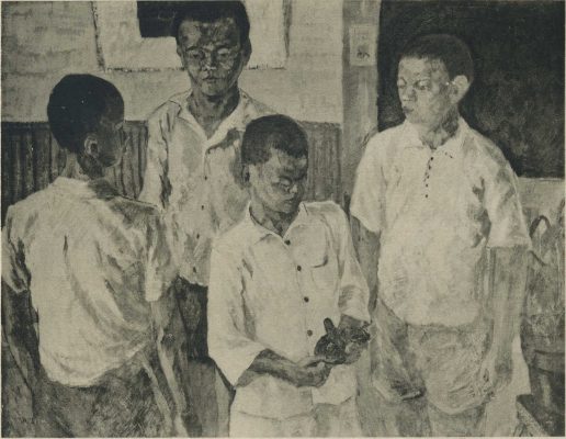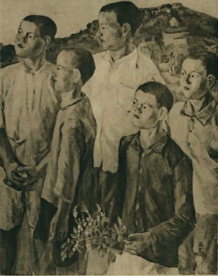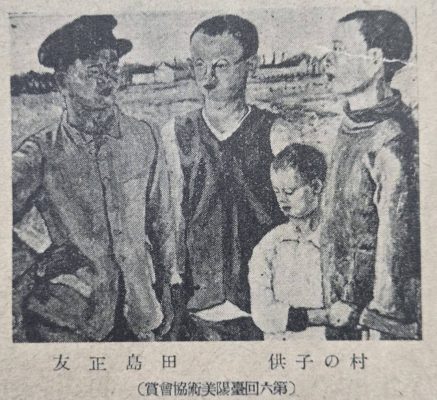 1942年田島正友在草山(陽明山)公學校任教,他再以〈小村之子〉(圖7)入選第五回府展。此作構圖與前兩件作品類似,背景的山坡地形應是學校所在地草山。綜觀這三件相同主題的創作,都以半身近景的構圖呈現四至五位孩子,聚在一起的孩童們少了童真歡樂,反而隱隱流露出凝重的愁緒。在〈土角之村〉文中,他寫著:「在學校所負責的班級,是剛學會日語的二年級學生。雖然有很多因為環境劇變而不知所措的事,但到了七月開始習慣在大洲的生活,此時日中戰爭爆發了。……即使戰爭開始了也毫無表情地過日子,儘管如此,根據臺車所帶來的消息,似乎開始有了對此事提高關注的人們。」田島正友在臺灣教書和創作的幾年中,正逢戰事爆發時期,這對他和學生必然有著不小的心理衝擊,作品中人物傳達出的愁緒,正扣合了的動盪不安的時局氛圍。