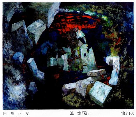 田島正友返日後,在教師工會的工作之餘仍創作不輟,並積極參與及帶領社區的藝文活動,曾創辦「宮崎県教職員美術展」、文學雜誌「しゃりんばい(石斑木,註3)」。他也幾乎年年參加「第一美術協會」的會員聯展並多次獲獎,1986年以〈追憶「崩」〉(圖8)獲得「会員努力賞」,1998年再以〈石の告発〉(石頭的控訴,圖9)獲得「長田賞」,作品均明顯有著對日本歷史的深沉省思。