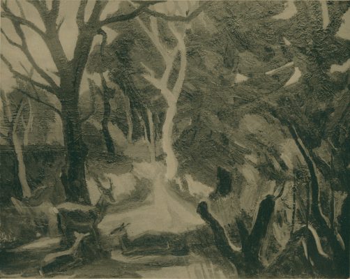 同年的秋季,廣瀨也以一幅〈古都の秋〉入選府展,簡練的筆法描繪了家鄉奈良的紅葉。據他所言,這幅畫作是根據居住奈良時期的速寫稿所繪製,直到來臺灣後才得以完成。(註5)畫面中描繪了三隻不同大小的鹿,從牠們頭上的角和體態判斷,應為公鹿、母鹿與小鹿。此外,左半邊的枯木則暗示了晚秋即將入冬的時節。