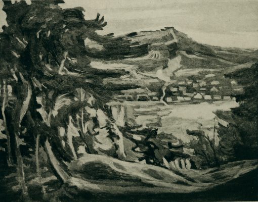 1938年的初夏之時,廣瀨創作了一幅富有「家鄉秋色」的作品,名為〈晚秋山麓〉,入選了臺中州美術展覽會。當時作品於臺中教化會館展出,為溫暖的臺中帶來一陣習習涼風。(註4)雖然從畫題上能得知應是繪製秋天景色,但無法知道確切地點。不過,對於當時剛來臺灣的他來說,應該還尚未有時間在臺灣的秋天進行寫生,因此推測這幅畫作的地點是在日本。
