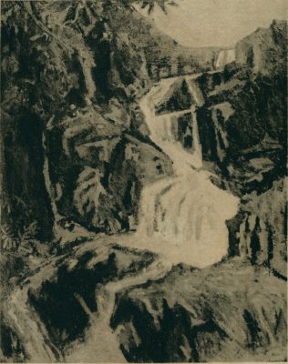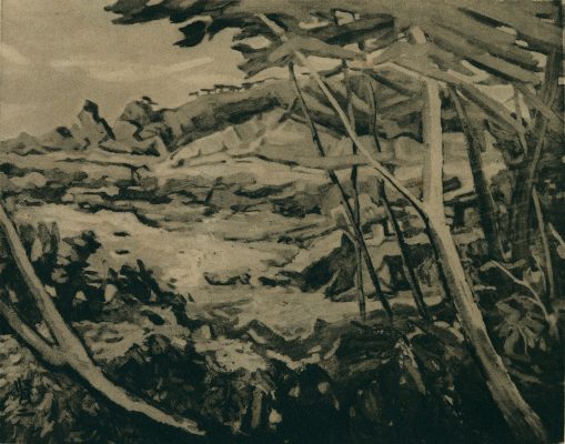1942年,發生了一個轉捩點,這年廣瀨開始使用「廣瀨賢二」作為筆名持續投稿畫作(註7)。雖然並不知道廣瀨用此名創作的契機為何,不過這應該是象徵著某種轉變吧!在當年,他幸運地共有兩件作品入選府展:一幅〈溪谷〉以直式描繪溪水沖刷的動態模樣,使人感受到一陣沁涼;另一幅橫式〈南紀風景〉的地點則是離家鄉奈良不遠處的和歌山西部。構圖猶如1941年繪製的〈鹿野園の秋〉,皆站在高處遠望,兩側以較深色的樹叢、樹幹框出一格視窗,讓觀者的視覺焦點專注於遠山。