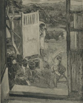 像是1940年入選府展的〈白い門(白門)〉正是他對日常細膩觀察的展現。從畫家視角來看,他應站在門口玄關處,望向門外的景色。畫面的右側是日式房舍木頭拉門,前庭停放著一輛三輪車;左下方堆放著數個盆栽。畫面中,白色外門成功地將觀者視角聚焦,門外還站著一位探出身子的小女孩。視線再向遠方望去,則是一片連綿的山景,由此推測畫作描繪的應是位在離山不遠的居所。