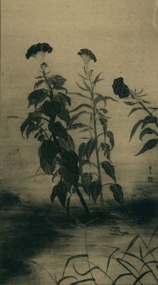 而她這幾次參展的作品皆是以花卉植物為題材。其中,1940年入選第三回府展的〈雞頭花〉(雞冠花),描繪了形態奇特、色彩鮮明的花種。值得一提的是,同樣以雞冠花為題材創作的女性東洋畫家村澤節子,其作品在構圖上與秋岡豐子形成有趣的對照。兩者皆採直式、背景留白的佈局,但呈現方式各有差異。村澤節子以整株雞冠花入畫,上方葉片較小、下方葉片逐漸寬大,側緣線條也更為鮮明,整體構圖顯得奔放而自由;相較之下,秋岡豐子則以較為繁密的特寫方式描繪雞冠花的莖與花序,以筆直纖細的莖枝作為主要構圖,營造出安定而和諧的畫面感。