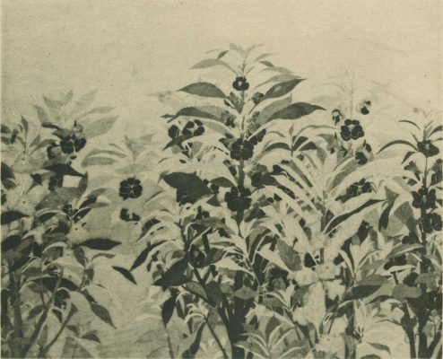 在第六回府展中,伊東豐子以臺灣常見的鳳仙花為題材,透過寫實的筆觸呈現鳳仙花的生長姿態。畫面以多株並列的鳳仙花為主要構圖,前後層次分明:前景葉片色彩較深,後方則以較淡的筆觸勾勒,營造出層層堆疊的效果。另外,還可以看見畫家透過畫作右下角的落款「豐子」。