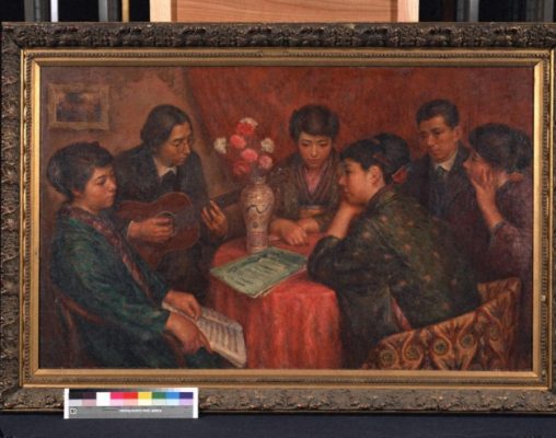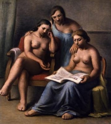 一位熱愛畢卡索的畫家——伊原宇三郎於1936年臺展十周年紀念展被邀請來臺灣擔任西洋畫部審查員。(註2)初次來臺擔任審查員的伊原宇三郎出品了三件作品〈湖畔の別莊村〉、〈婦人坐像〉以及〈橫臥裸婦〉,其中兩件人物像獲得相當高的評價,〈橫臥裸婦〉甚至被小林總督所購入。(註3)若是看看伊原宇三郎1921年入選帝展的東京美術學校畢業作〈よろこびの曲〉,可以發現他作畫風格的變化,從感性滿溢的日本外光派走向新古典主義的端正構圖。