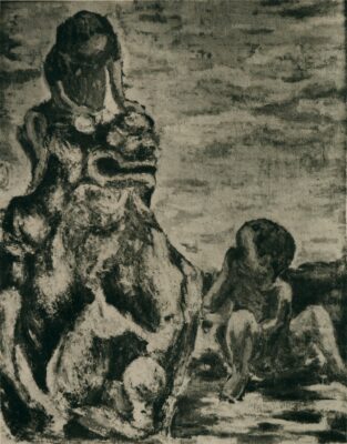 〈村童〉(1941)畫中的石獅子採扭首的姿態,怒目圓睜,鼻短如蒜,耳大如扇,額頭有飽滿隆起的頭鬃,祂張開的嘴巴下方似乎也可見鬃毛的線條。頭部以下的部位較難以辨識,隱約可見項飾和綬帶的線性造型。較明確的是石獅右下角有顆渾圓的繡球,頗為符合《臺灣石獅圖鑑》中南方獅的形制(圖2)。(註8)畫家純真的目光投向了戰事後方殖民地的孩童,或許是不願,或許是難以表現身處戰爭中的孩子該有怎樣的面孔,孩童雖然在嬉戲卻並非無憂無慮,漆黑的眼眶和裸露的身體使他們沒有個體特徵。