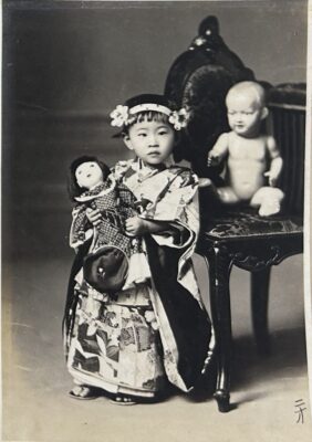 一本寫著「Photographs」的厚重寫真帖,封面以埃及風格的花紋裝飾。從書末的廣告標籤可以得知,這本寫真帖購自東京神田的東京書院,時間可能已經是終戰之後。翻閱寫真帖後發現,裡面照片的時序雖然有些混亂,但仍可以看得出來原主人細心地貼上照片,並且在側邊註記說明文字。寫真帖中最早的一張照片,約莫拍攝於1922年。相片中的小女孩身著華麗的和服、頭上綁著花飾,手中還拿著玩偶。照片的主角是年僅兩歲的殿村愛子,也是這本寫真帖的原主人。