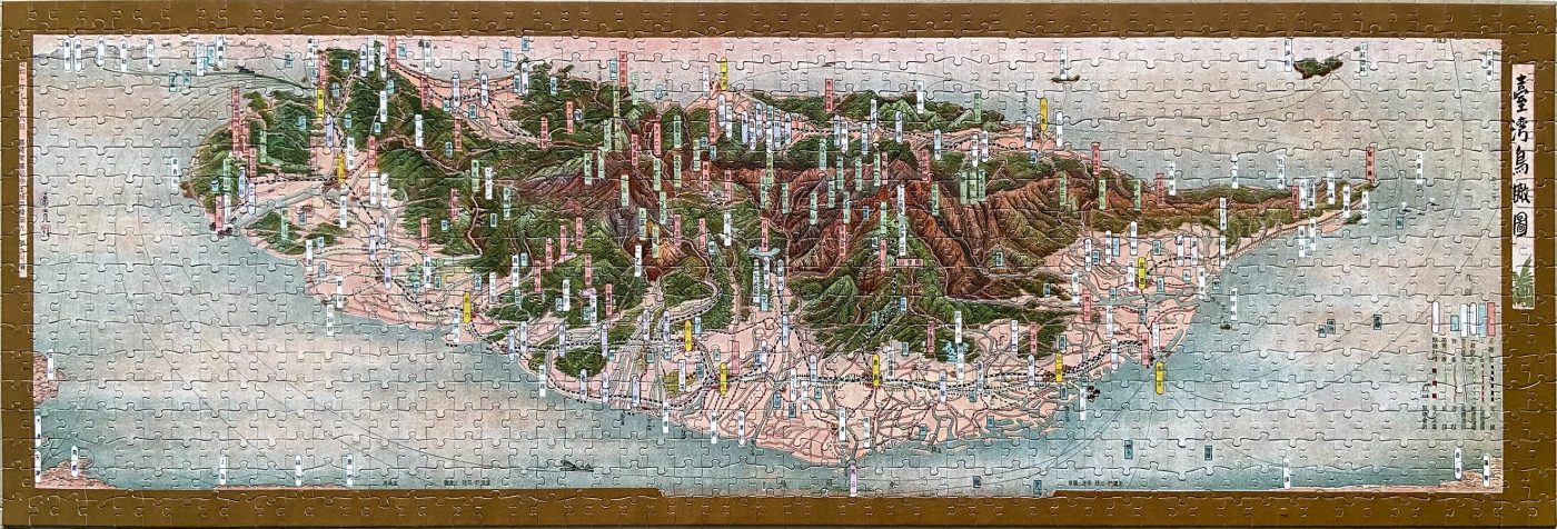 本製品は台湾島を台湾海峡の方角から中央山脈の方向、すなわち西から東へ見た鳥瞰図です。北東に沖縄、神戸、東京などの場所が見えて、歪みが若干大きいです。一方、図面には台湾の地名や山脈、河川、交通ルート、産業及び名所(台湾神社や北投温泉など)が標記されています。