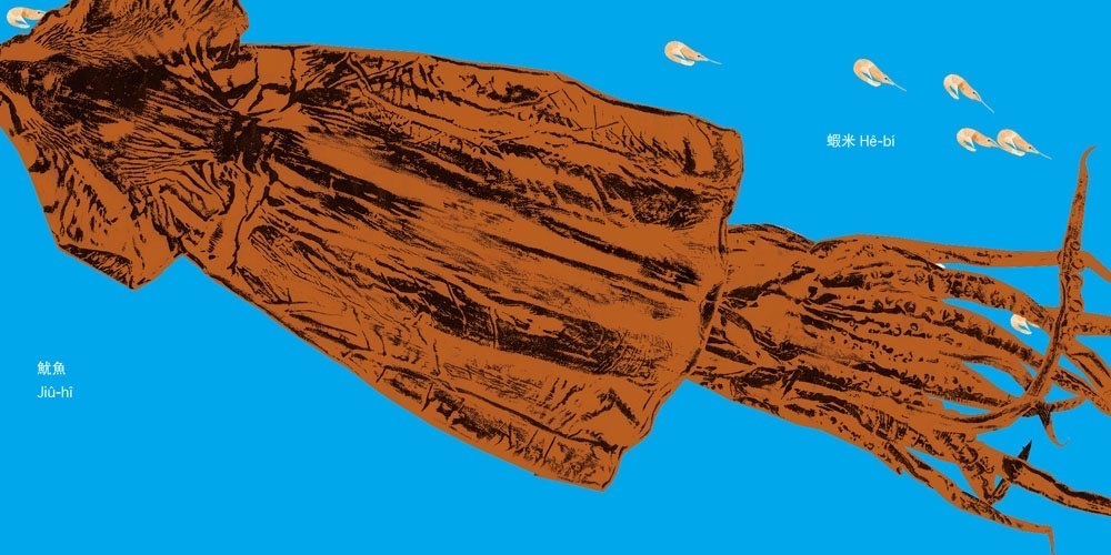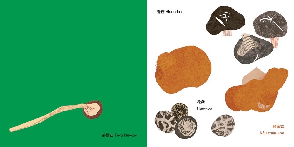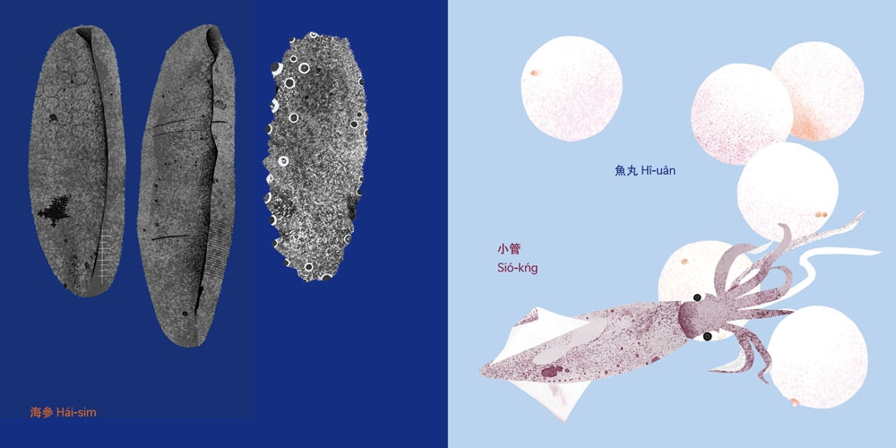 除了繪本之外,為了讓讀者完整體會到大稻埕的風味,另外策劃一本《大稻埕ê山珍海味》台文小圖鑑,邀請擅長以各種媒材作畫的藝術家吳睿哲操刀,以真實的南北貨來創作,拼貼出充滿藝術感的南北貨小圖鑑。