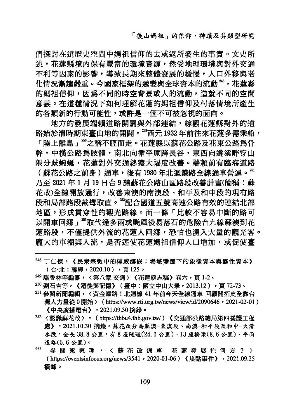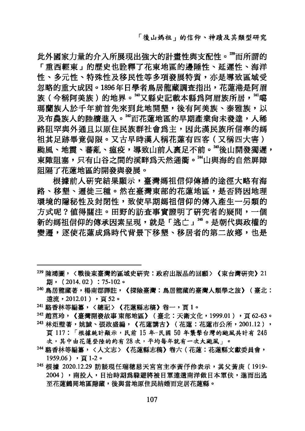 後山漢族人的移墾、播遷過程的歷史,涉及政治操控、社會變遷、自然環境的阻隔,以及天然災害的衝擊。後山媽祖信仰得以移播,與此有著緊密的連結關係。廟宇碑碣刻文提供媽祖神像,及其香火緣起的探源佐證。田野證實後山媽祖信仰的傳播及發展,無法離開移民和墾民的直接或間接關係。