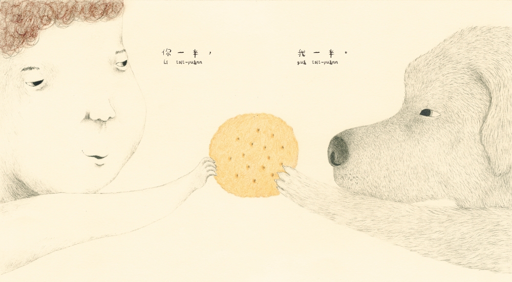 作者儲玉玲運用句式的變化,以輕快且富有韻律感的台文語句,描寫小孩與狗狗之間溫馨又逗趣的分享日常,再搭配繪者儲嘉慧的生動圖像,細膩的呈現孩子與狗狗之間的互動與表情變化,每一頁都像一齣有趣的小劇場,讓人一讀再讀、會心一笑。