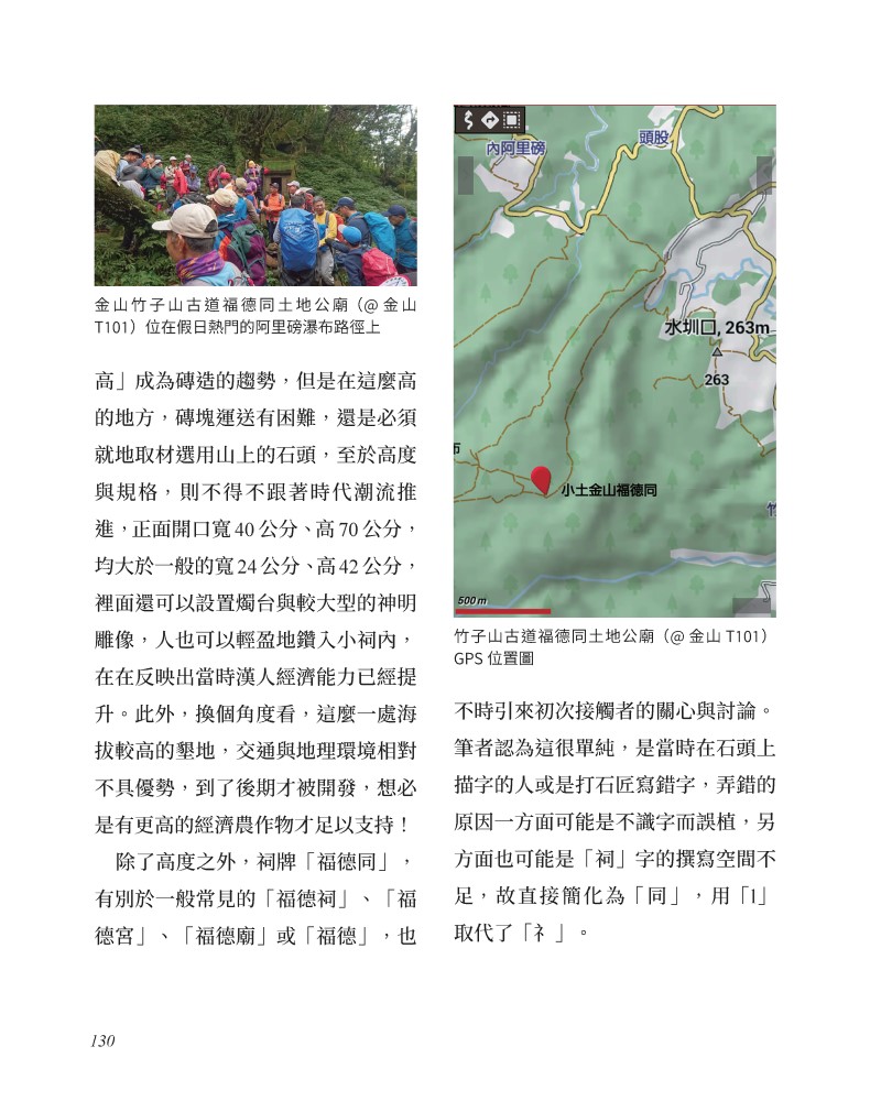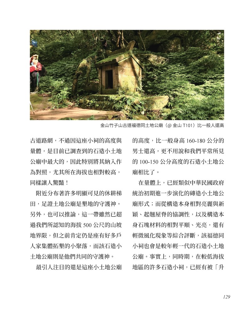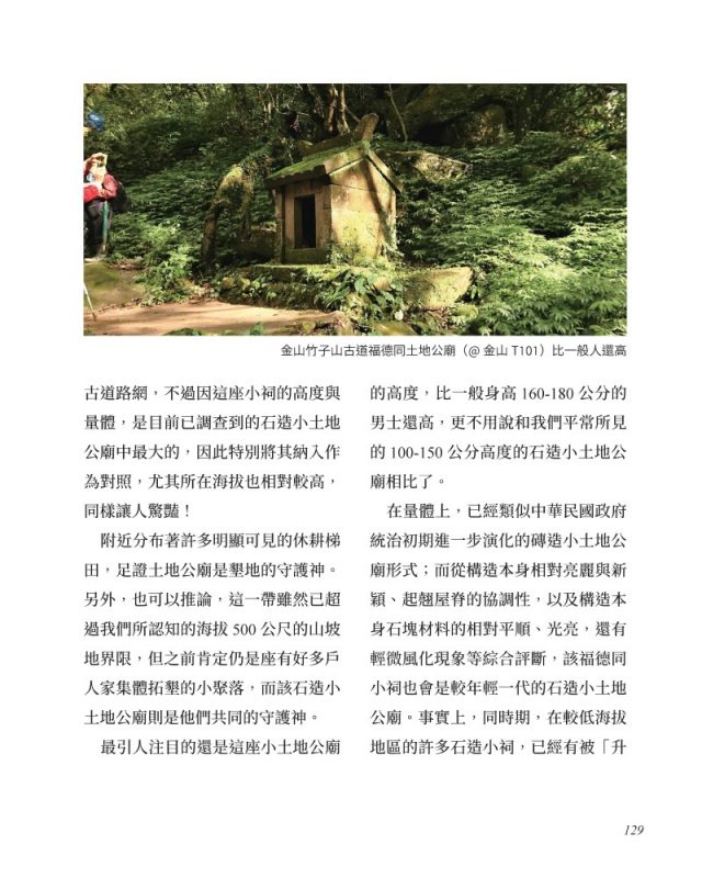 身為專業建築師的作者,經過多年踏查,不但記錄這些散落在古道上的歷史珍寶,更以建築專業的角度,闡述這些石造小廟的形制演變,歸納出相似處與獨特性。