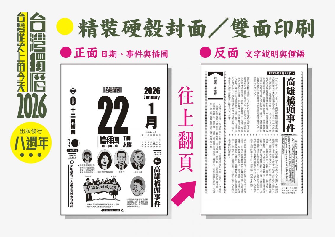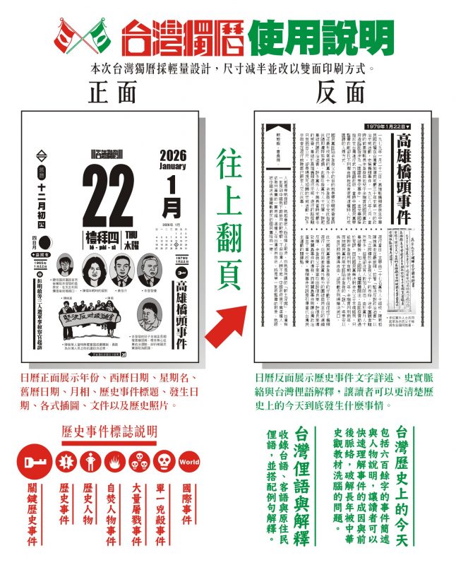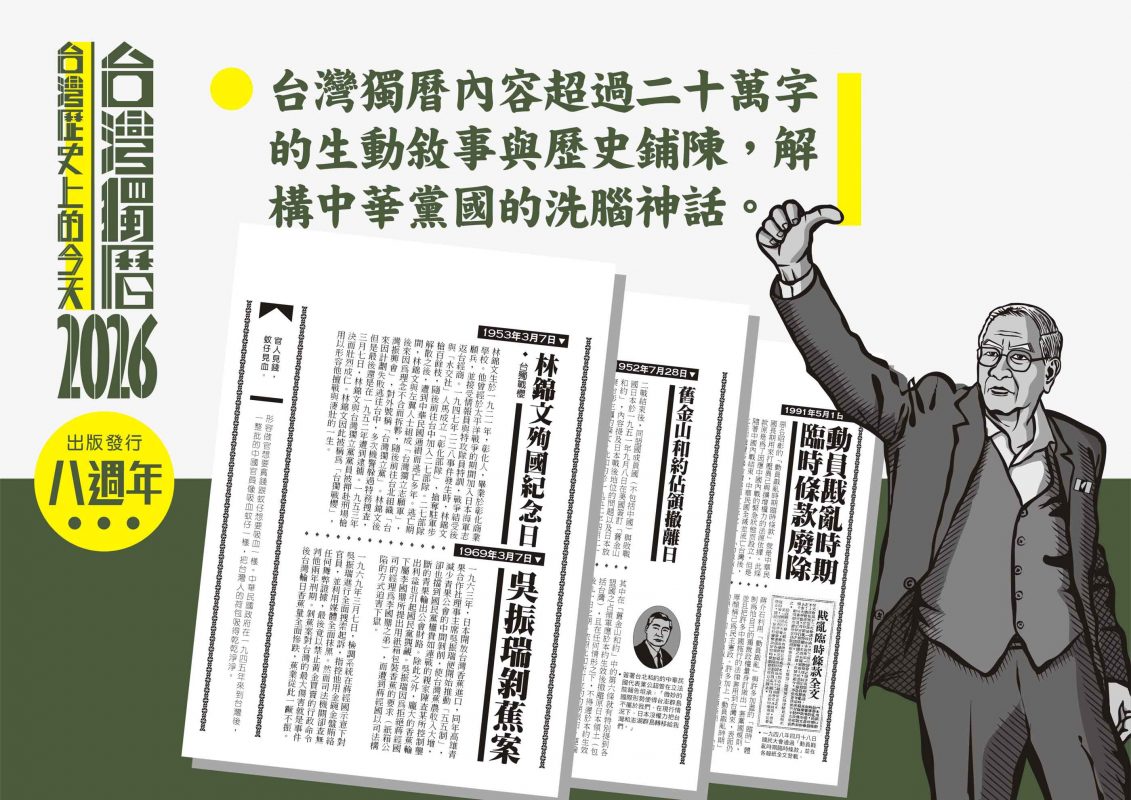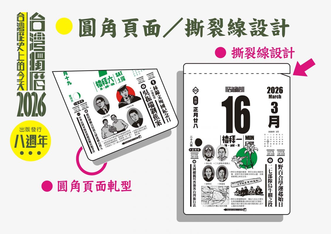 台灣獨曆大量收錄台灣歷史上的今日故事。三百六十五天,每天都有一到三則的歷史簡介,引領讀者快速進入影響台灣深遠的關鍵人物或是事件