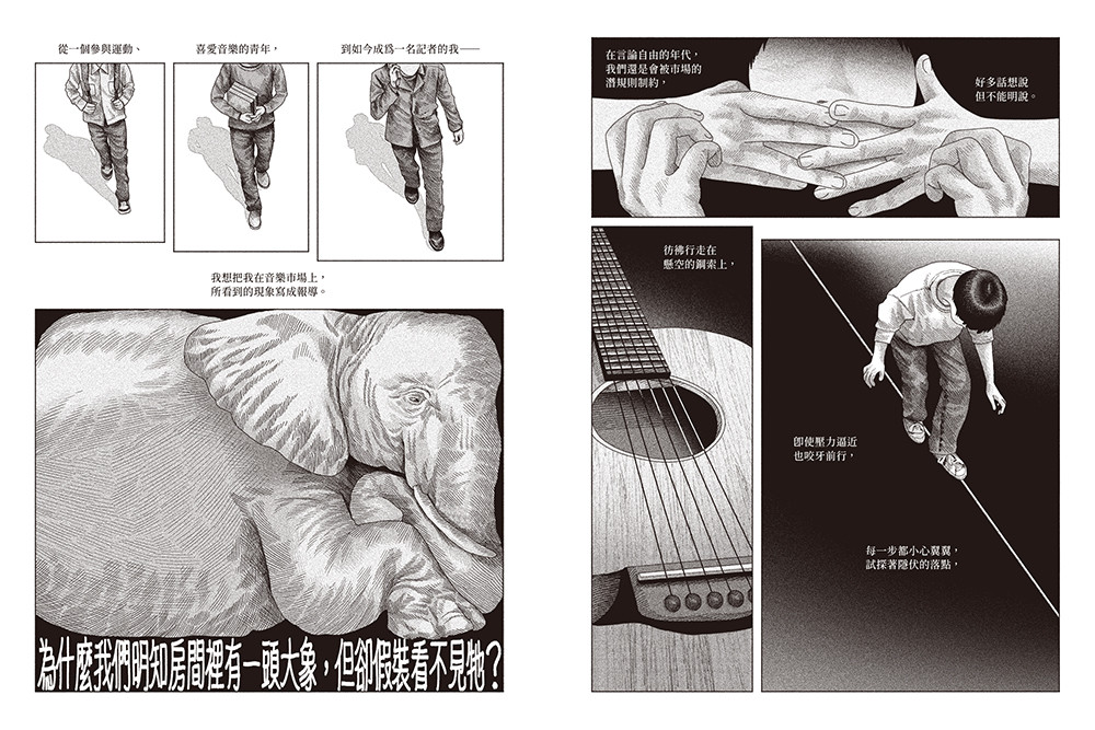 房間裡的大象可能就是自己。《報導者》給我的印象一直是冷靜、銳利、盡可能做到上帝視角般周全而不帶感情,但這篇台灣音樂人夾在兩岸之間的矛盾報導,透過漫畫家高妍與編輯部「再退一步」的詮釋,讓記者的角色進入其中,不但將報導生動轉譯成圖像,也讓我代入更有人性的採訪觀點,看見房間裡的大象,看見那個同樣在極化環境中,一邊學習理解課題、一邊試著課題分離的自己。——謝東霖(漫畫家)