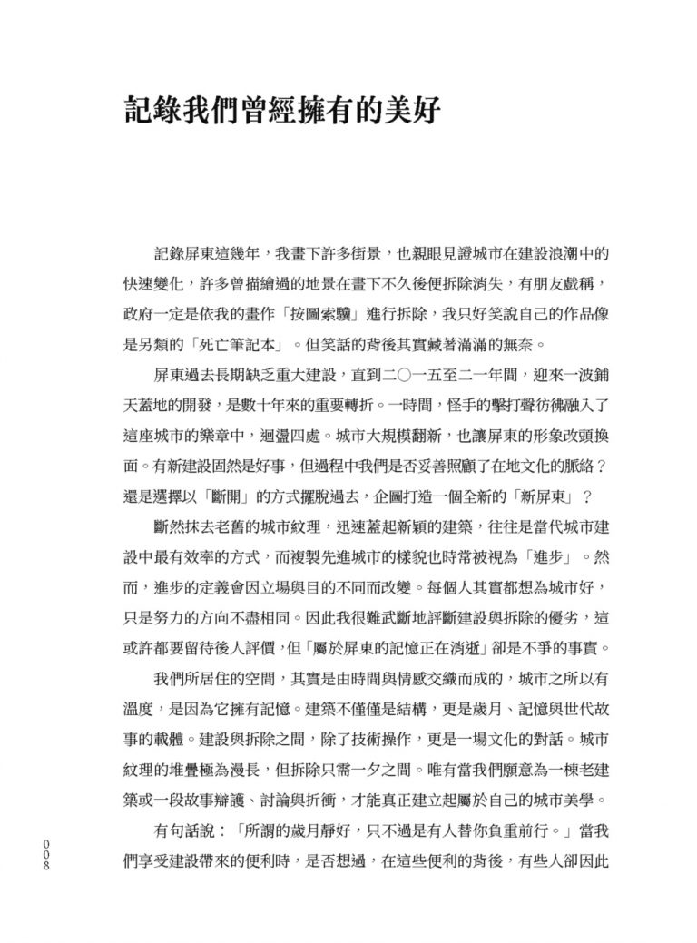 書中的每一幅畫、每一段文字,都是對消逝事物的默禱。它讓人思考:在「進步」的名義下,我們究竟放棄了什麼?那些被拆除的不只是建築,更是歲月、故事與記憶的容器。