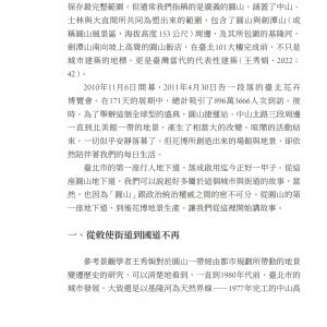 捷運雙連與民權西路站之間,面臨水泥化開發的危機。在地居民積極動員倡議,成功保留了原本的綠地。中山北路二段84巷底,因雨水下水道整修,偶然挖掘出來的古圳道,在居民積極保存的主張下,得以命名為「宮前町砌石大溝」,並成為在地社區推動景觀守護的百年記憶。這兩個由在地居民站在最前面,積極抵擋官僚不當決策的民間力量,不僅是臺灣社會珍貴的資產,更是具體推動社會進步的關鍵能量,深具啟發性。