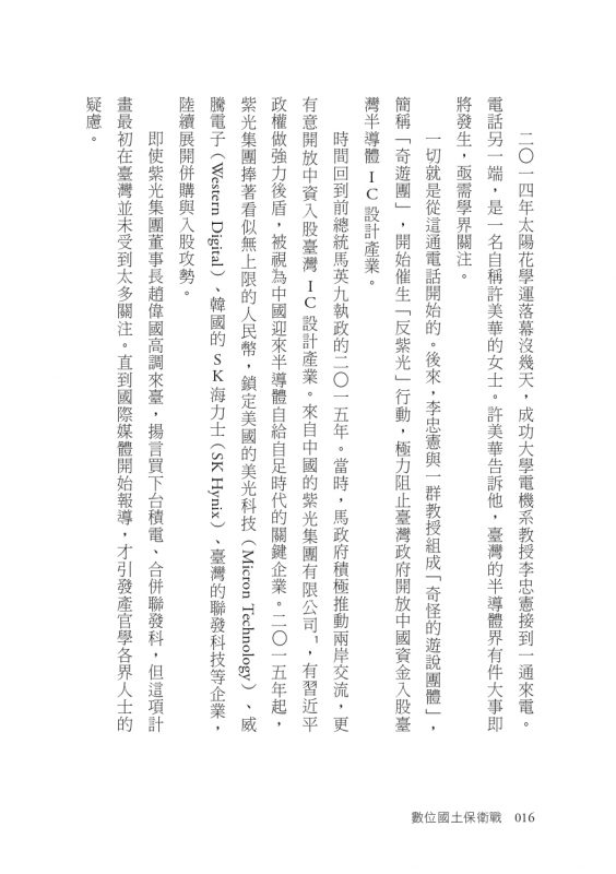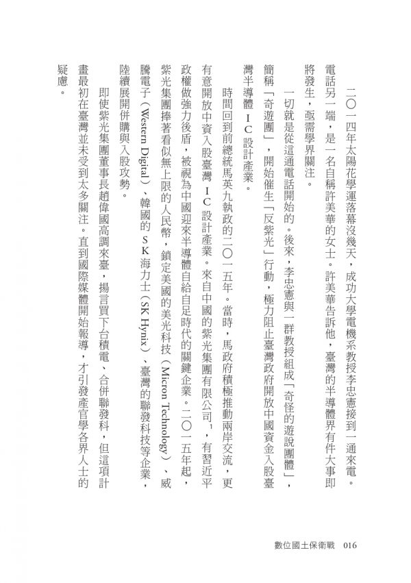 本書由李忠憲、林宗男、林修民三位長期關注數位防衛的資通訊專家共同撰述,意在勾勒出這場無形戰爭的全貌。他們不僅是研究者,更是行動者:三人皆曾參與二〇一五年「反紫光行動」,阻止中資滲透臺灣IC設計產業,守住半導體這道國安防線。此次三人首度聯手,結合專業研究與第一線經驗,透過八個環環相扣的章節,全面解析從半導體、物聯網、AI、數位身分證到電子投票,臺灣如何在數位國土上遭遇中國的系統性威脅。