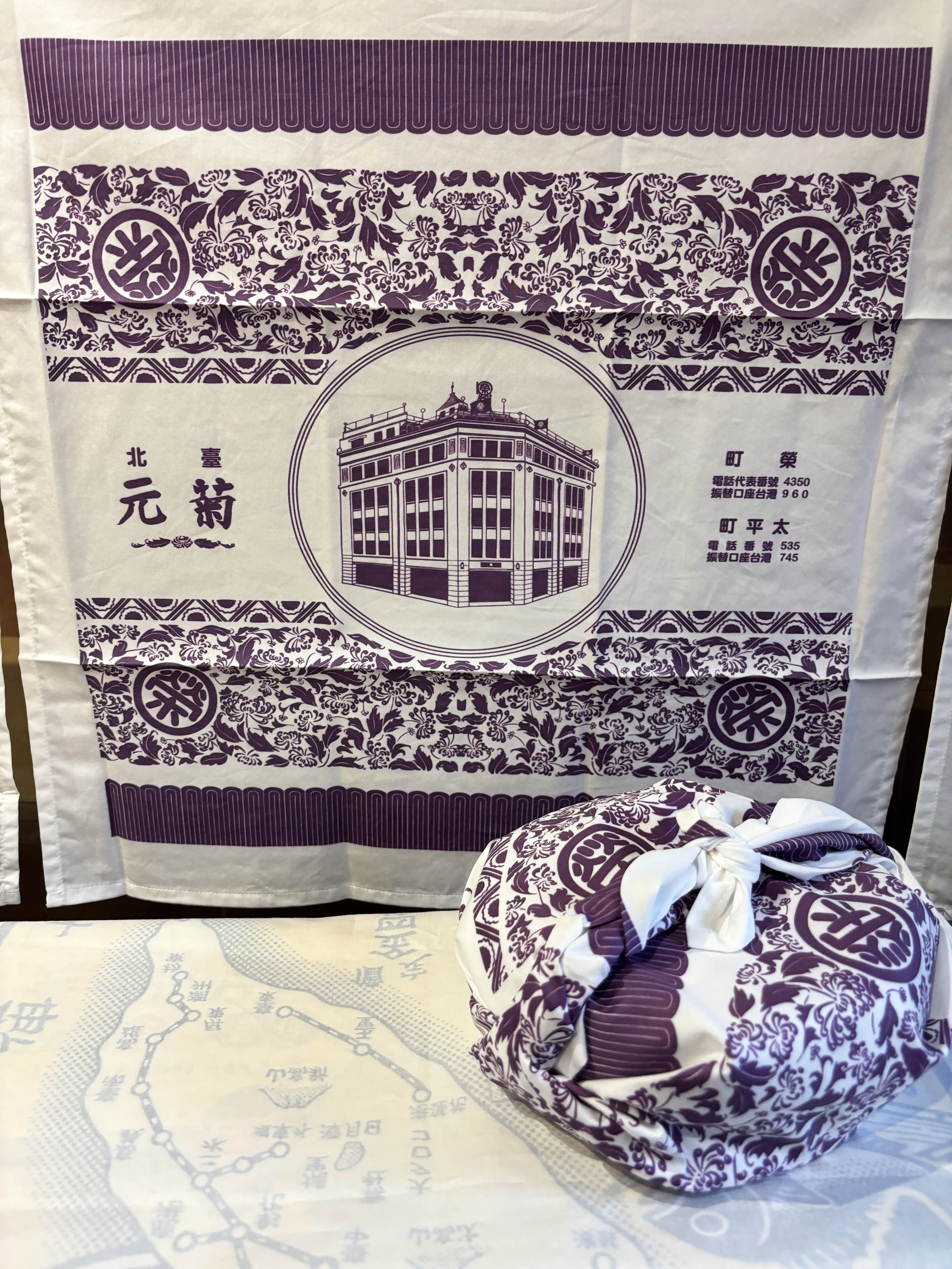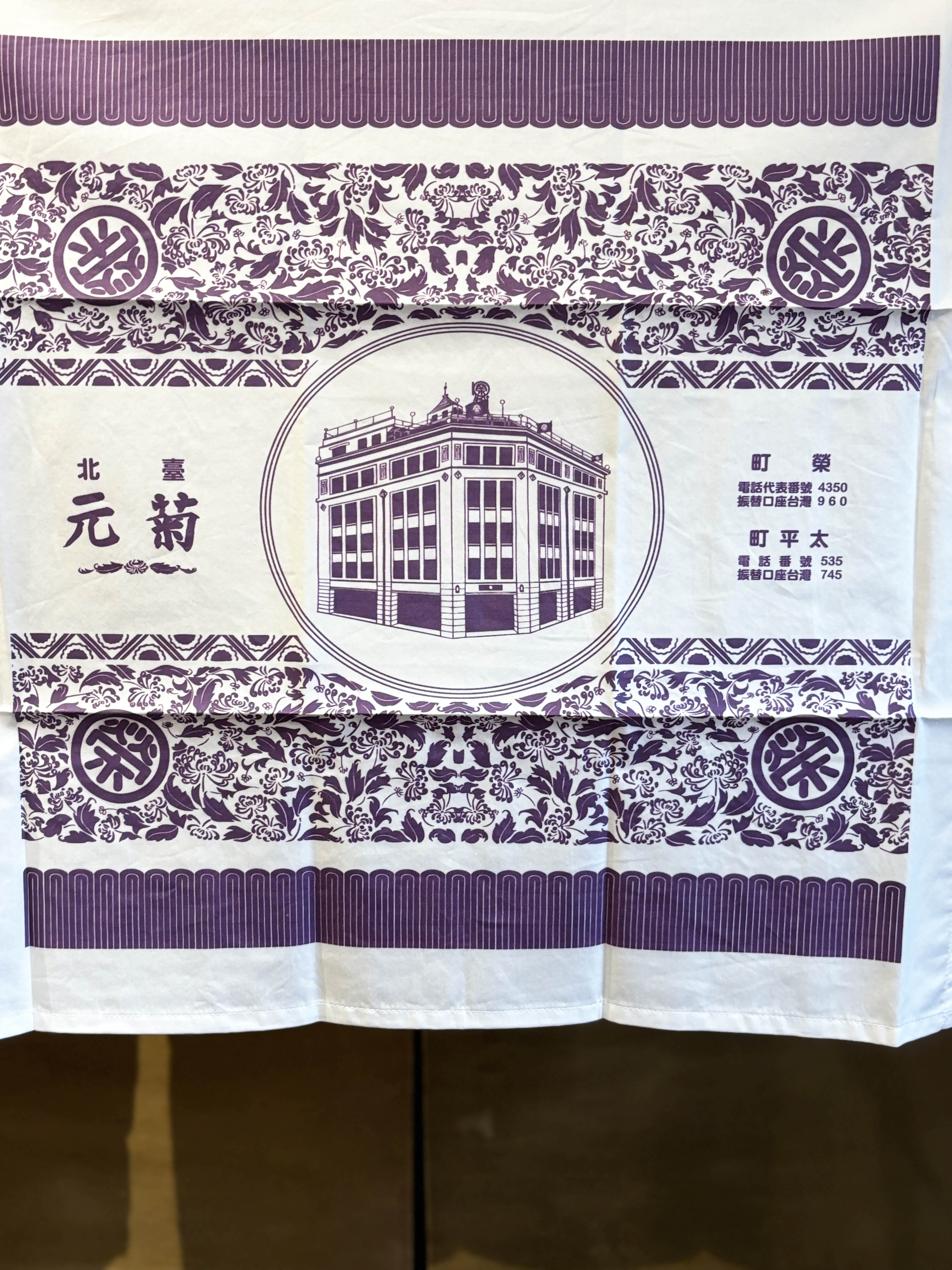 The cloth design was adapted from the wrapping paper of Kikumoto Department Store. Opened in 1932, Kikumoto was Taiwan’s first major department store. Its striking façade, crowned with the prominent “Ei” character—standing for both founder Eiji Shigeta and its location in Ei-machi (Ei District)—left a lasting impression of the era.
