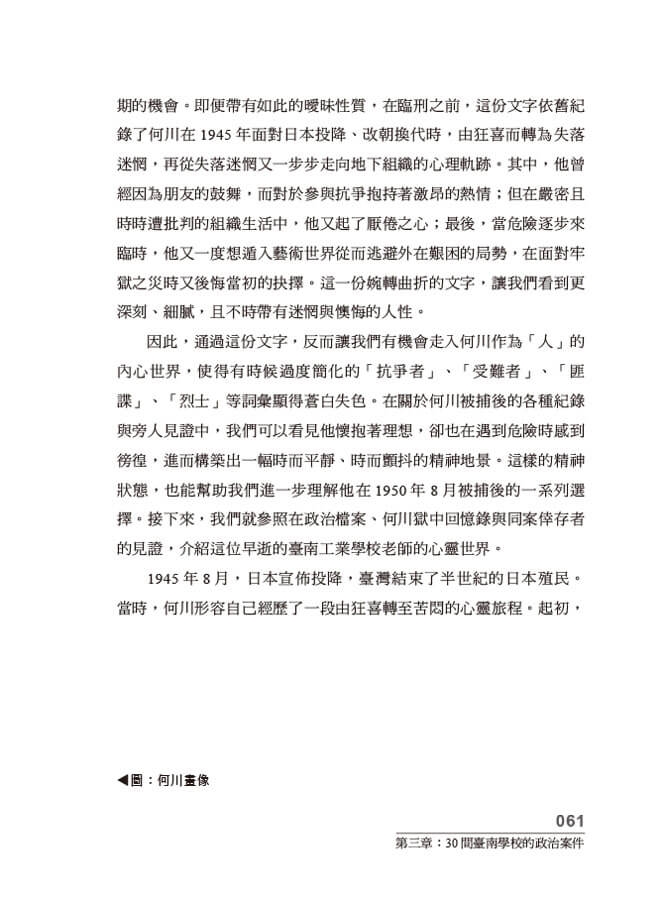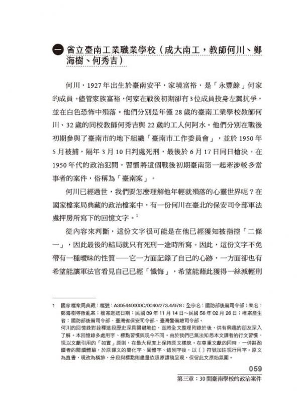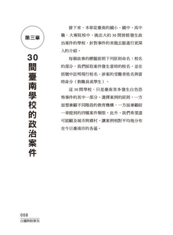 最後,書後附表提供目前已知臺南校園政治案件的全部清單。盼望能拋磚引玉,邀請更多有志於相關歷史的教師、學生、市民,能自主投入進一步的探索與詮釋。