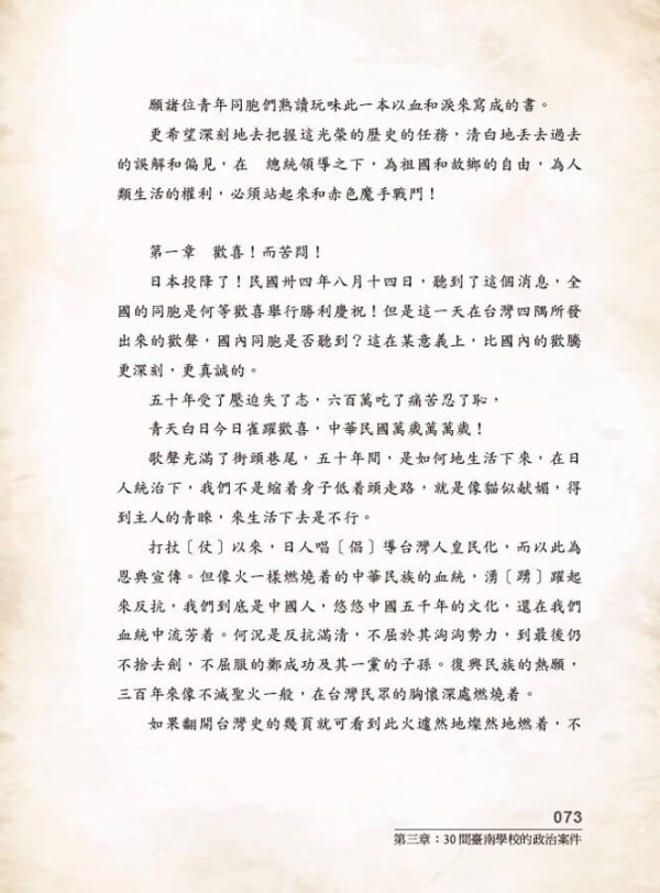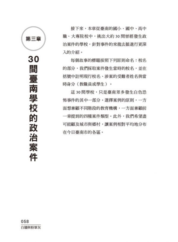本書開篇簡要介紹臺灣「白色恐怖」的整體規模、軌跡、身分組成等資訊,藉此指出「校園政治案件」在整體白色歷史中的定位。
