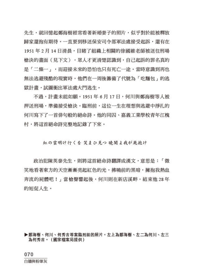 誠摯希望本書能成為教育工作者「就地取材」的索引,您若找到自己感興趣的「線頭」,搭配大量開放的政治檔案,及仍有機會持續出土的記憶見證,就有機會讓長年沉默於公共記憶的白色歷史,重新成為當代探索、對話、思考的一面鏡子。