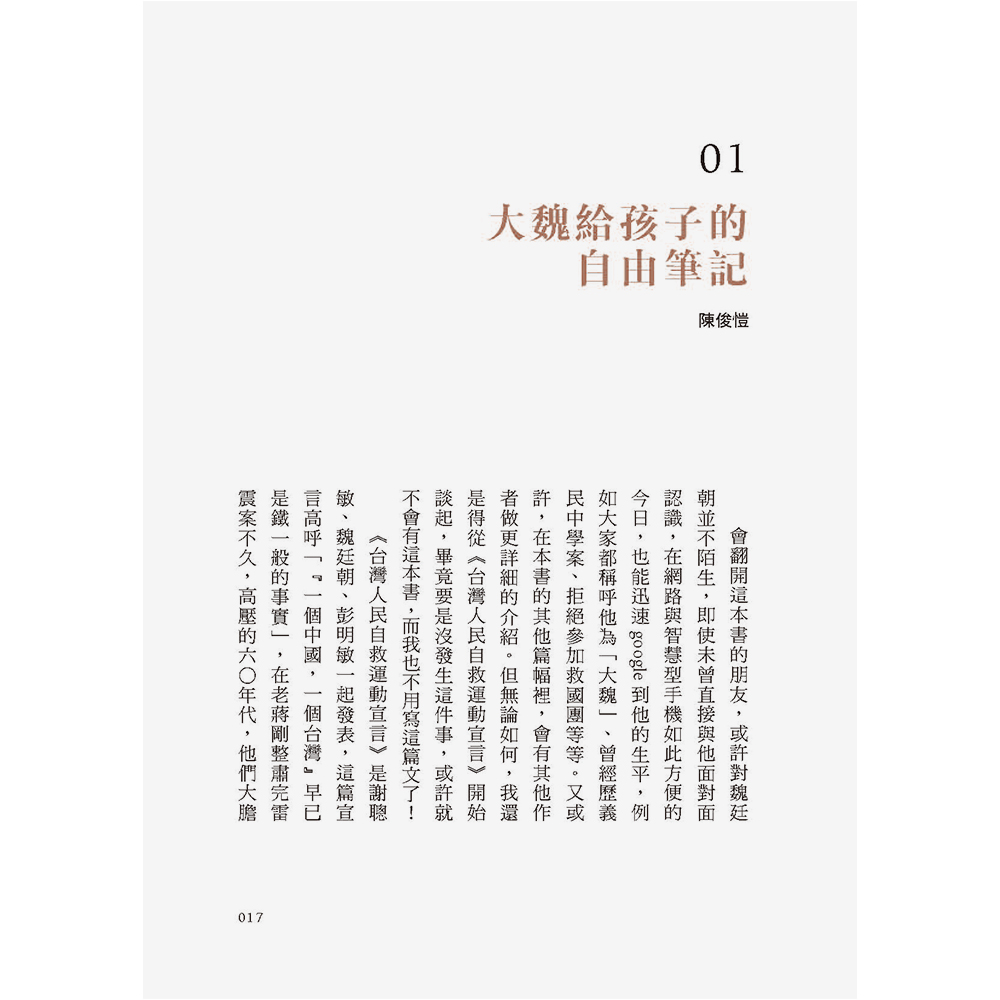 本書收錄六篇專文,分別從「自由主義」、「教育理念」、「家庭觀」、「童趣」、「人生選擇」與「生活觀察」等視角切入,深度分析魏廷朝寫給兒子「大可」魏新奇、女兒「小筠」魏筠的書信。在「完滿人格者」的形象之外,讓我們更貼近魏廷朝的思想與內心,從中窺見他對平凡幸福的渴望與追求,對自由民主的想望與祝福,發現一個更完整、更立體、更貼近你我生命經驗的魏廷朝,體會他自由思想的日常與家庭實踐,愛家庭與愛土地一以貫之的生命哲學。