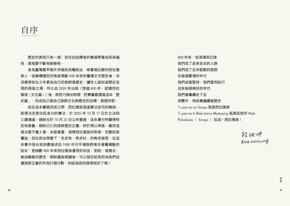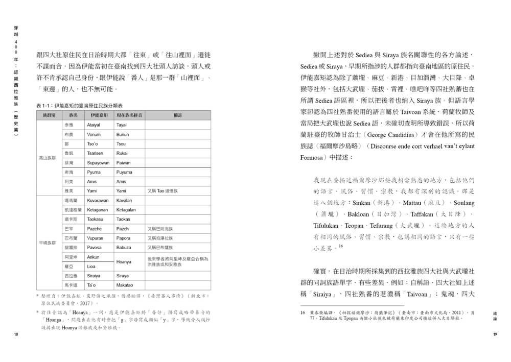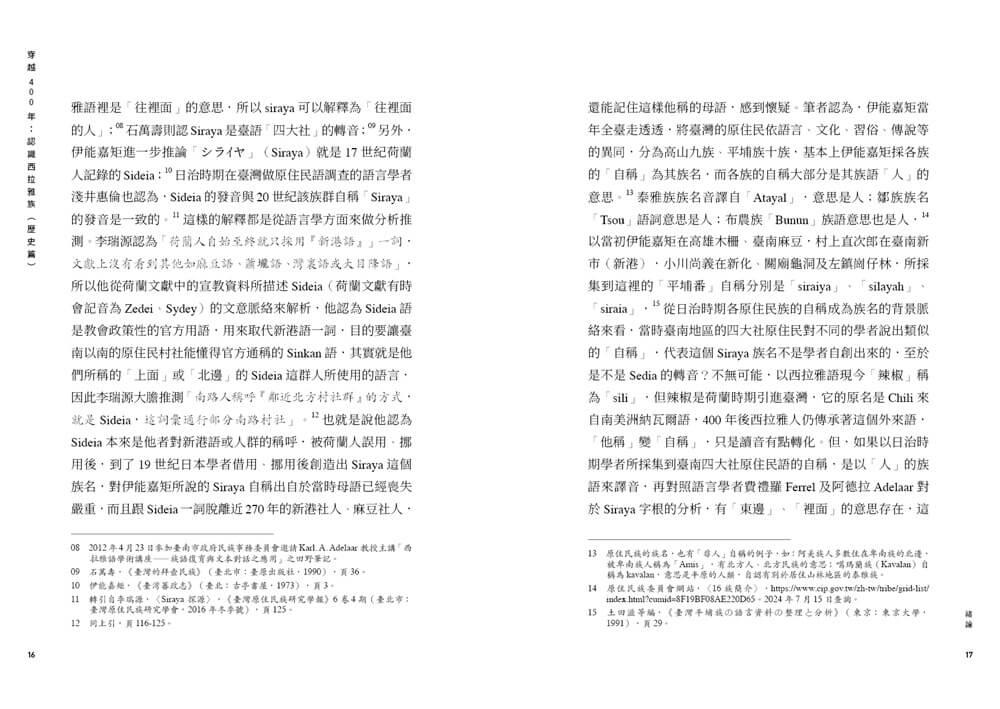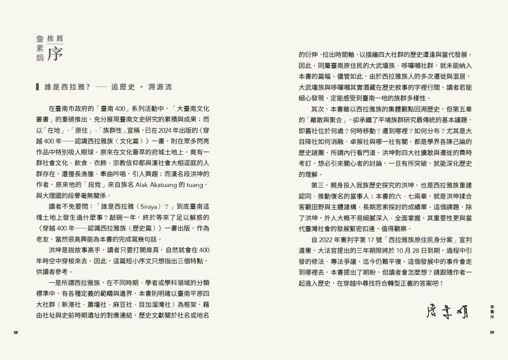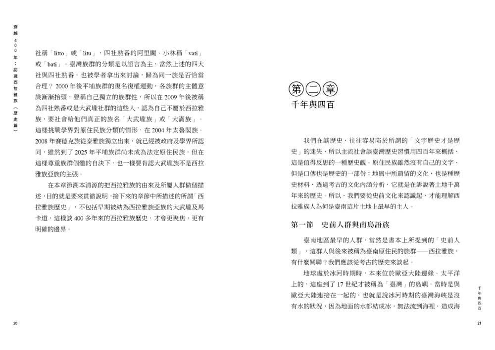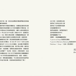 《穿越400年:認識西拉雅族(歷史篇)》是作者投身西拉雅族文史運動二十年來的心血結晶,以嚴謹的學術態度,揭示被文字隱匿卻充滿韌性與尊嚴的族群歷史。展讀此書,就是走進這段活生生的歷史現場,感受西拉雅族如何在夾縫全力生存,如何無畏失語力拚重獲自我的歷程。