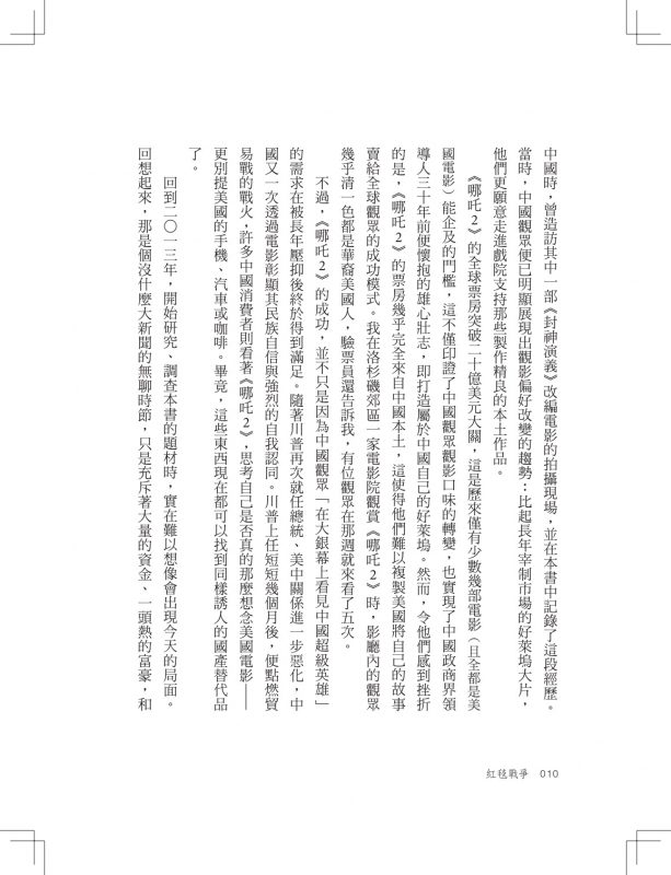 「《紅毯戰爭》講述了好萊塢和中國之間一段微妙而巨大的變化。當好萊塢發現自己急需中國資金時,中國也意識到自己能夠掌控、甚至奪取好萊塢最擅長的力量:包括引人入勝、操縱情感、塑造生活方式的敘事能力,以及透過音樂的高潮段落和湯姆・漢克斯與小孩的深情對話讓觀眾落淚的本事⋯⋯在舒瓦澤細膩的敘事中,好萊塢地位的屈辱式下滑,與中國軟實力的迅速崛起,交織成鮮明對照……這是一本引人入勝的作品,讀來令人著迷。舒瓦澤以大量卓越的採訪與田野調查,為這個故事增添了強烈的臨場感與說服力。」——《紐約時報書評》(The New York Times Book Review)