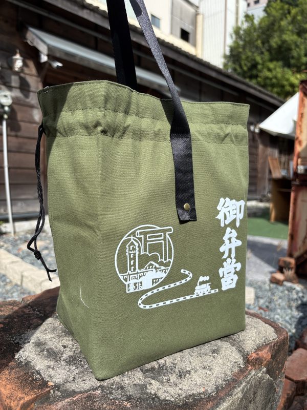 This drawstring bag combines the imagery of vintage railway bentos and station stamps, reimagining the memory of buying a bento from platform vendors through a train window in modern form.