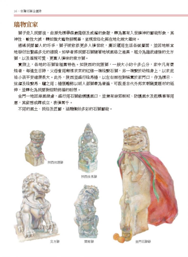 自古以來中國並沒有獅子,隨著外邦進貢、貿易交通與佛教加持傳入後,與傳統文化融會,逐漸改頭換面。其踏球、含珠、弄幼獅的豐富裝飾,以及宛如世間父母子群像的寫照,在世界獅文化中獨樹一幟,格外情深韻長。