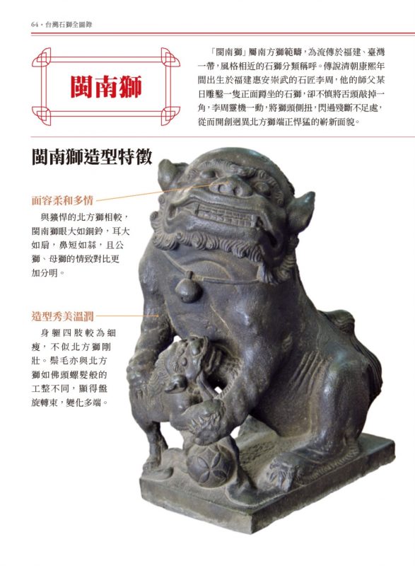 從明清閩粵先民移墾、日本殖民統治、二戰後國府來臺,積累多元的石獅風貌。若以造型分類,可分為活潑的閩南獅、渾厚的嶺南獅、端正的狛犬、剛猛的北方獅和寫實的西洋獅五大風格,每一種都風格殊異,自成一大千世界。