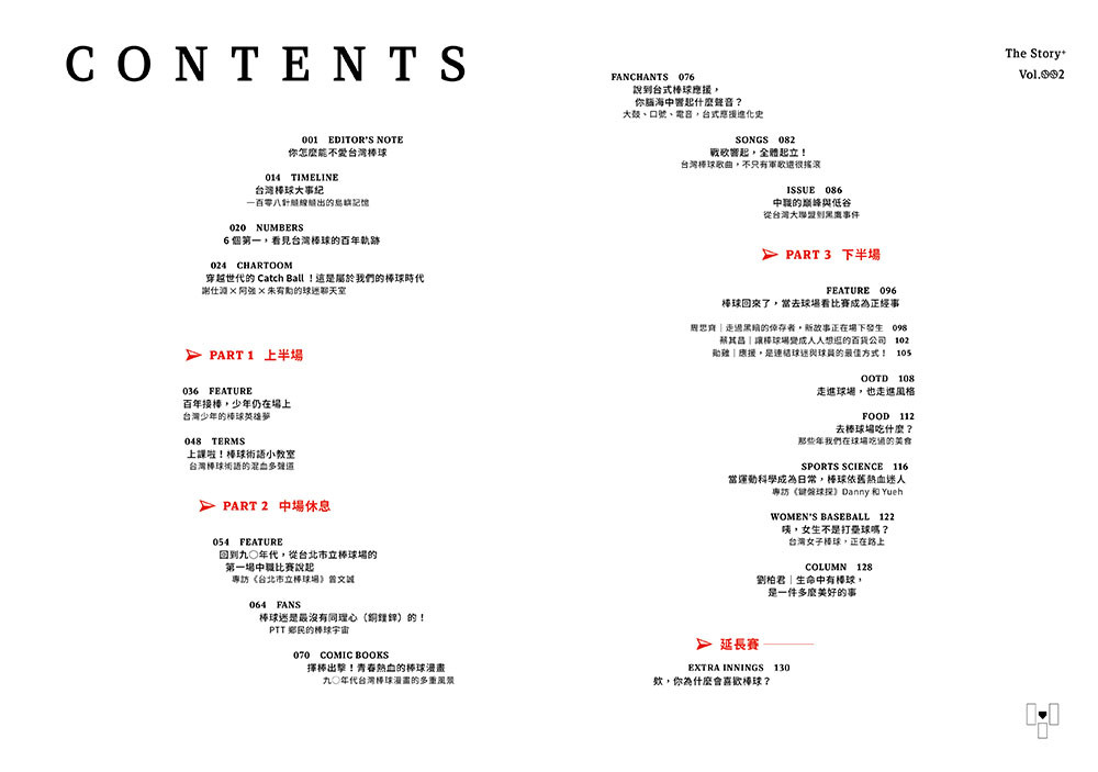 本期《故事別冊》將台灣百年棒球文化以一場「棒球比賽」為結構,全書分成上半場、中場休息與下半場,以球迷最熟悉的節奏,重新走進台灣棒球的百年現場: