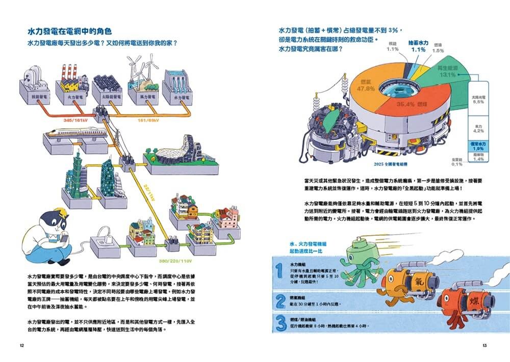 本書由插畫家CROTER精心繪製,把看似複雜的水力發電變得有趣又好懂。不論是第一次認識能源的小讀者,或是想重新理解電力故事的成人,都能從中找到樂趣。