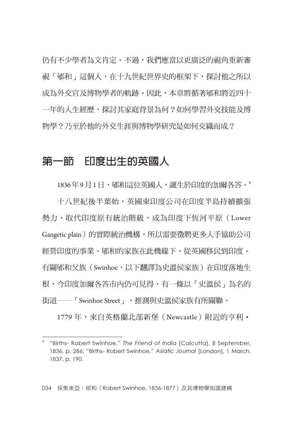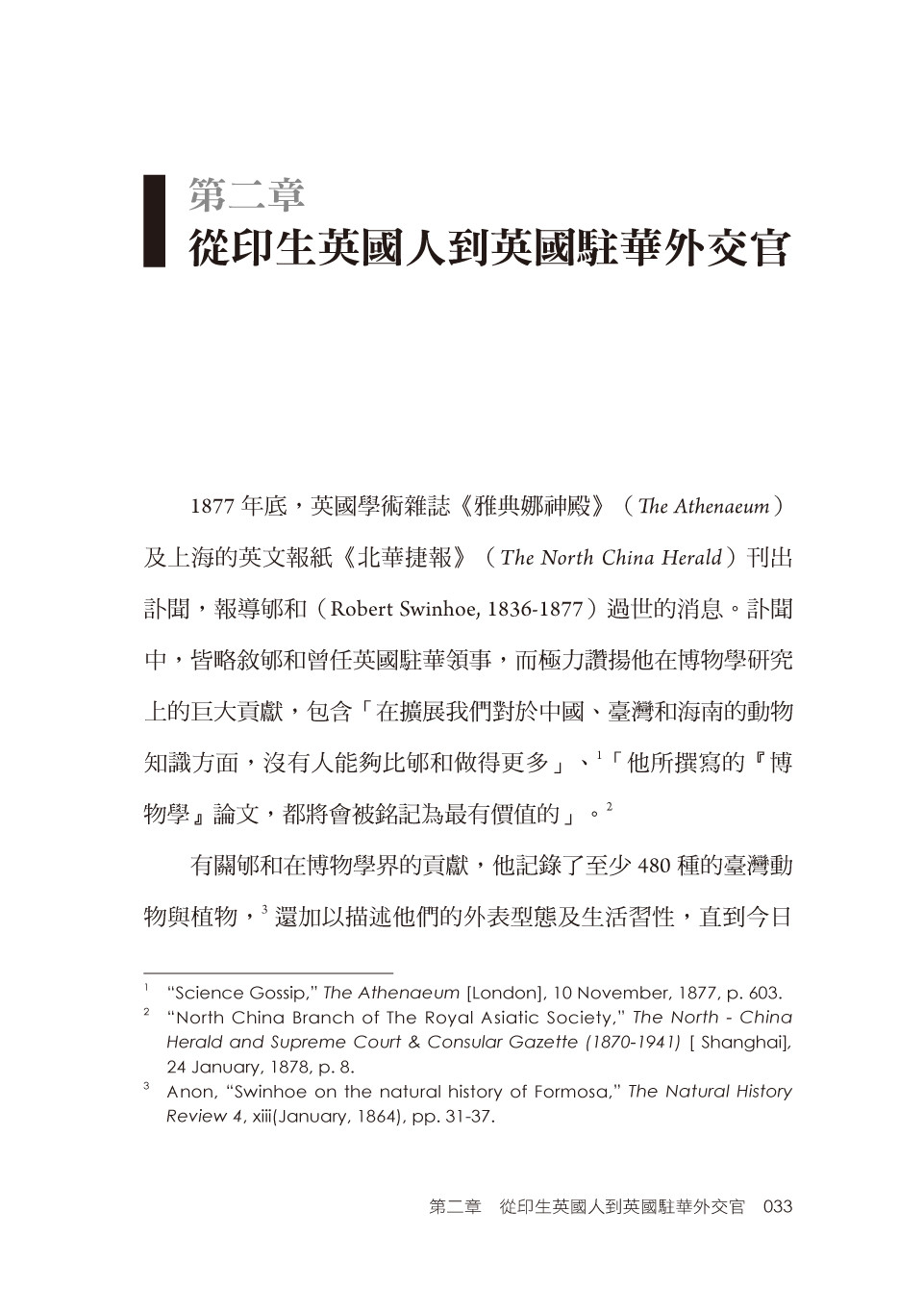 本書有別於傳統以學者為主角的博物學史研究,而以郇和的生命經歷為核心,考察郇和側身於十九世紀中英關係與自然學術發展之間,是在何種學術氛圍下進行東亞田野採集工作,及其如何以長期的田野工作經驗,回應並挑戰當時西方的博物學界,從中勾勒出一位西方博物學者在東方從事自然考察的身影。