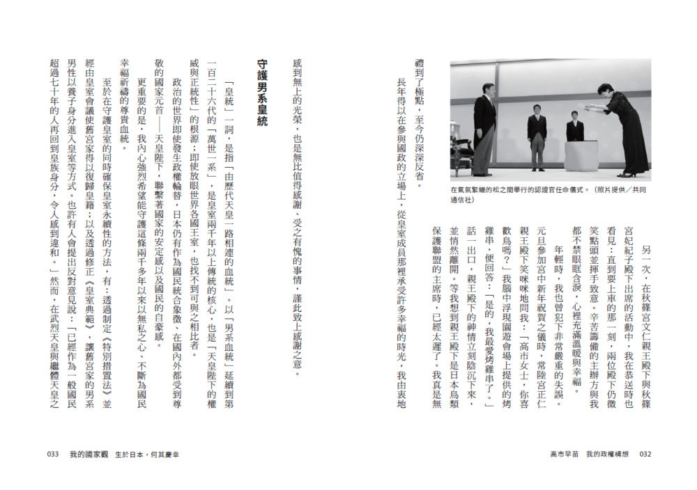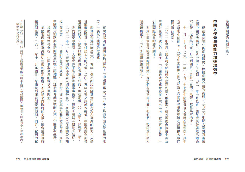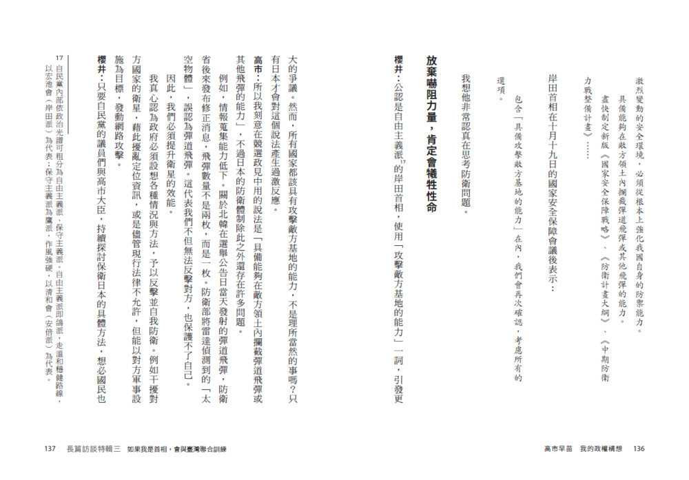 《高市早苗:我的政權構想》由高市首相本人執筆,從憲法修正、國防體制重建、經濟安全保障、剖析烏克蘭戰爭、檢視臺灣與印太戰略等關鍵議題切入,呈現高市早苗作為「能夠作決斷的政治家」的全貌。他主張在憲法中明確定位國防軍、強化日本的安全與主權,並以強烈的責任感回應國際局勢的劇烈變動。此外,他也以堅定的國家觀、明確的保守主義路線,以及毫不妥協的行動力,直指日本權力核心。高市亦追溯他的政治啟蒙與在松下政經塾的點滴,以及他與前首相安倍晉三之間深刻的情感與理念傳承。